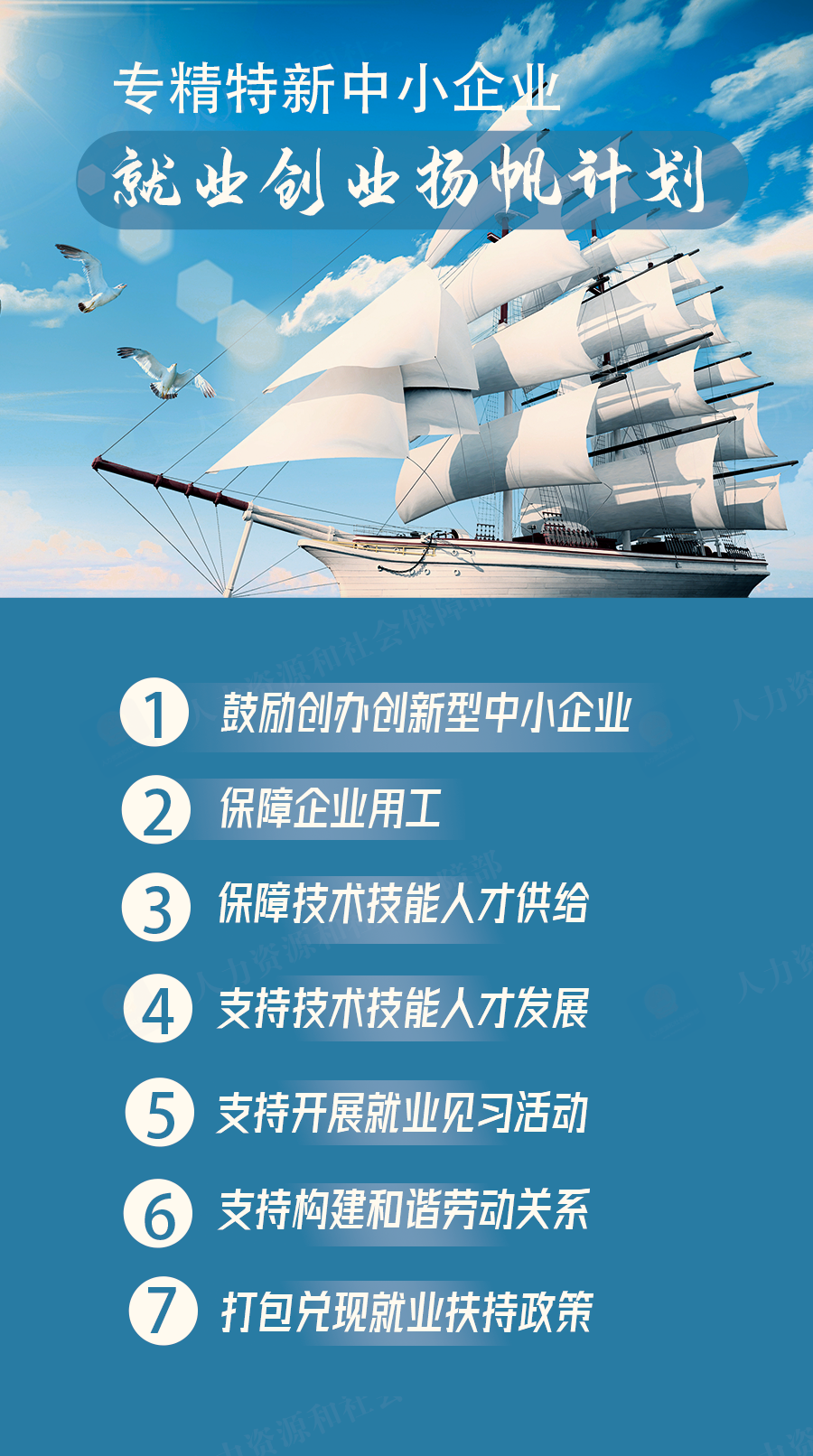 《通知》明确七个方面内容:一是鼓励创办创新型中小企业。加大创业帮扶力度,优先提供创业孵化支持,提供项目指导、风险评估、实战模拟等服务。加强融资支持,对符合条件的,加快落实创业担保贷款、稳岗扩岗专项贷款等政策。二是保障企业用工。将专精特新中小企业纳入重点企业用工服务范围,在“10+N”公共就业服务活动中设立招聘专区,促进供需匹配。深化劳务协作机制,探索建立用工余缺调剂机制,缓解用工难题。三是保障技术技能人才供给。实施数字技术工程师培育项目,分职业、分方向、分等级开展规范化培训。梳理专精特新中小企业急需紧缺职业(工种)信息,推广订单、定向、定岗式培训。四是支持技术技能人才发展。动态调整职称专业设置,健全完善职业标准和评价标准体系。贯通继续教育、职称评审、职业培训政策,依托数字技术工程师培育项目取得高级专业技术等级证书的,可作为申报高级职称的重要参考;取得中级、初级专业技术等级证书的,可纳入各地各部门中级、初级职称认定范围。五是支持开展就业见习活动。实施专精特新中小企业青年就业见习领航行动,开发见习岗位,建设就业见习基地,对组织开展就业见习的企业,落实就业见习补贴政策;对见习期满提前留用的,给予剩余期限见习补贴。六是支持构建和谐劳动关系。指导企业依法合规用工,鼓励围绕劳动报酬、休息休假、福利待遇等开展集体协商。加强劳动争议隐患排查,健全重大集体劳动争议应急处置机制,保障企业和劳动者合法权益。七是打包兑现就业扶持政策。加强大数据应用,开展数据比对,主动向受益对象推送政策。推进“人社服务快办行动”,推广“直补快办”模式,按规定一揽子兑现吸纳就业补贴、社保补贴、扩岗补助等政策。